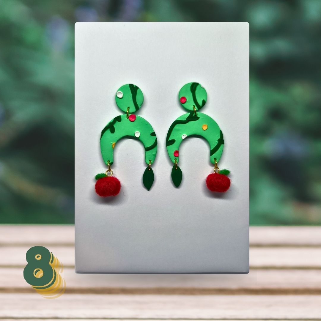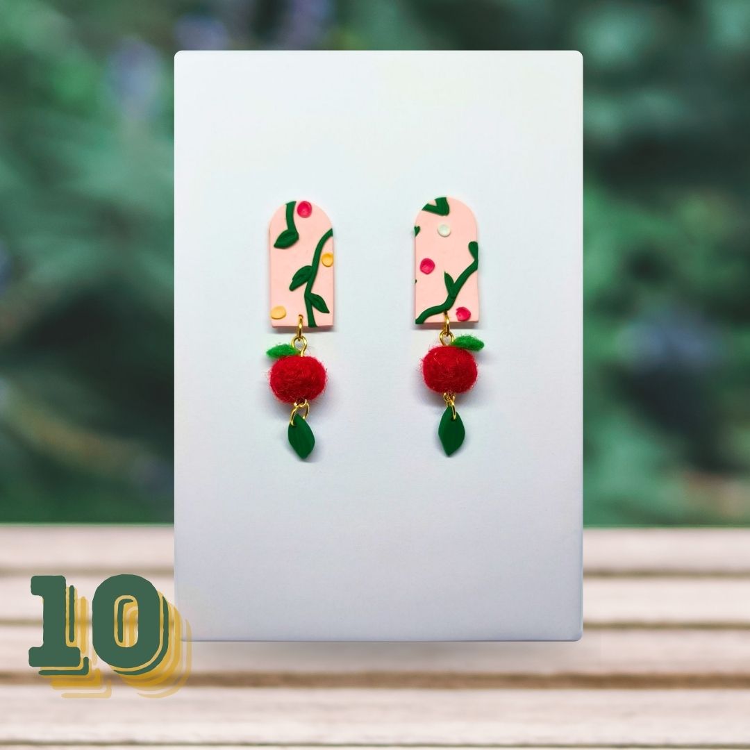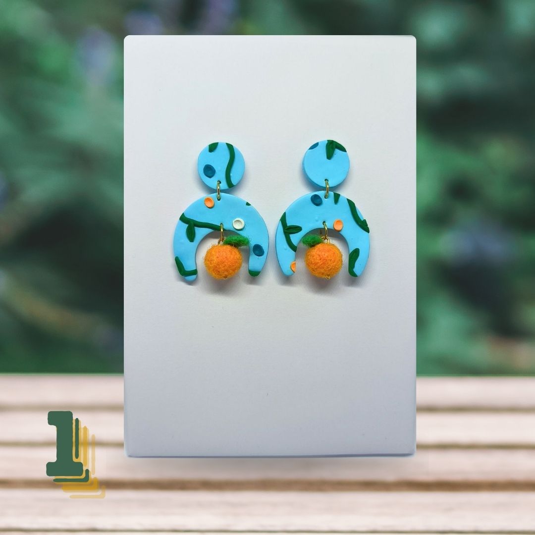 Queremos que entres en nuestra Huerta y lleves a casa una pieza única llena de colores. Hemos creado esta colección 100% a mano, inspirándonos en las frutas y los entramados de tallos, flores y hojas. Cada modelo de aretes es exclusivo, ya que por su elaboración los patrones de las bases son irrepetibles! Estas bases están hechas en arcilla polimérica, liviana, resistente a la humedad y se complementan con apliques hechos en fieltro agujado con lana natural.