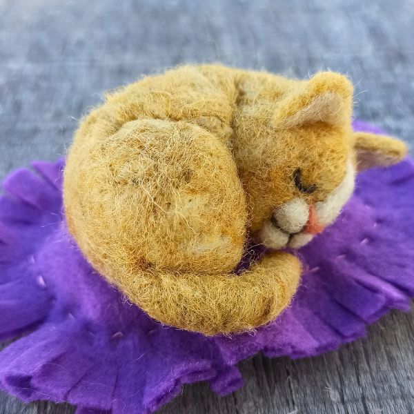 Podrás hacer uno de nuestros diseños exclusivos en casa: este precioso gatito dormido con una expresión tierna y serena, será una experiencia de fieltrado única y divertida, con la que podrás ver el proceso de fieltrar una pieza desde cero, hacer caras y cuerpos de felinos un poco más realistas y crear un hermoso animal para practicar tu técnica.